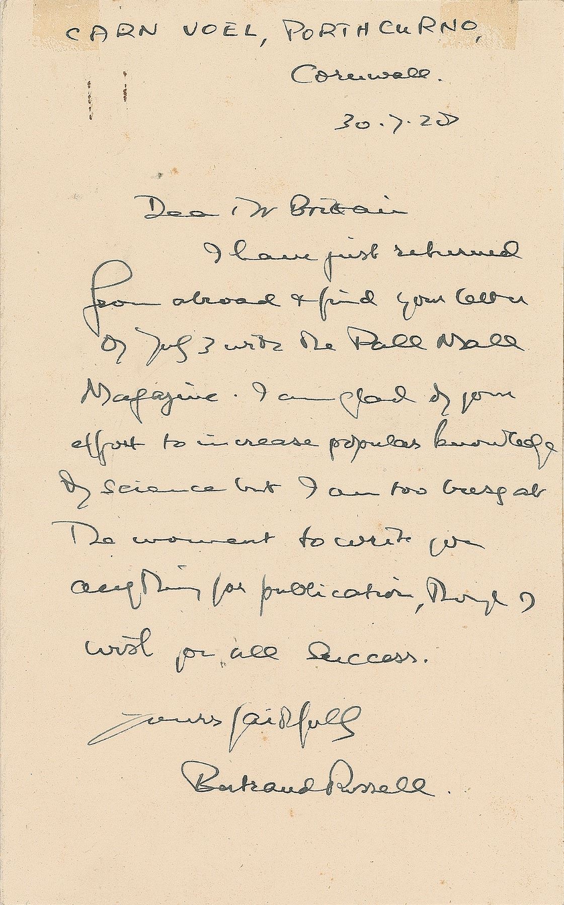I have just returned from abroad and find your letter of July 3 with the Pall Mall Magazine. I am glad of your effort to increase popular knowledge of science but I am too busy at the moment to write you anything for publication, though I wish you all success.