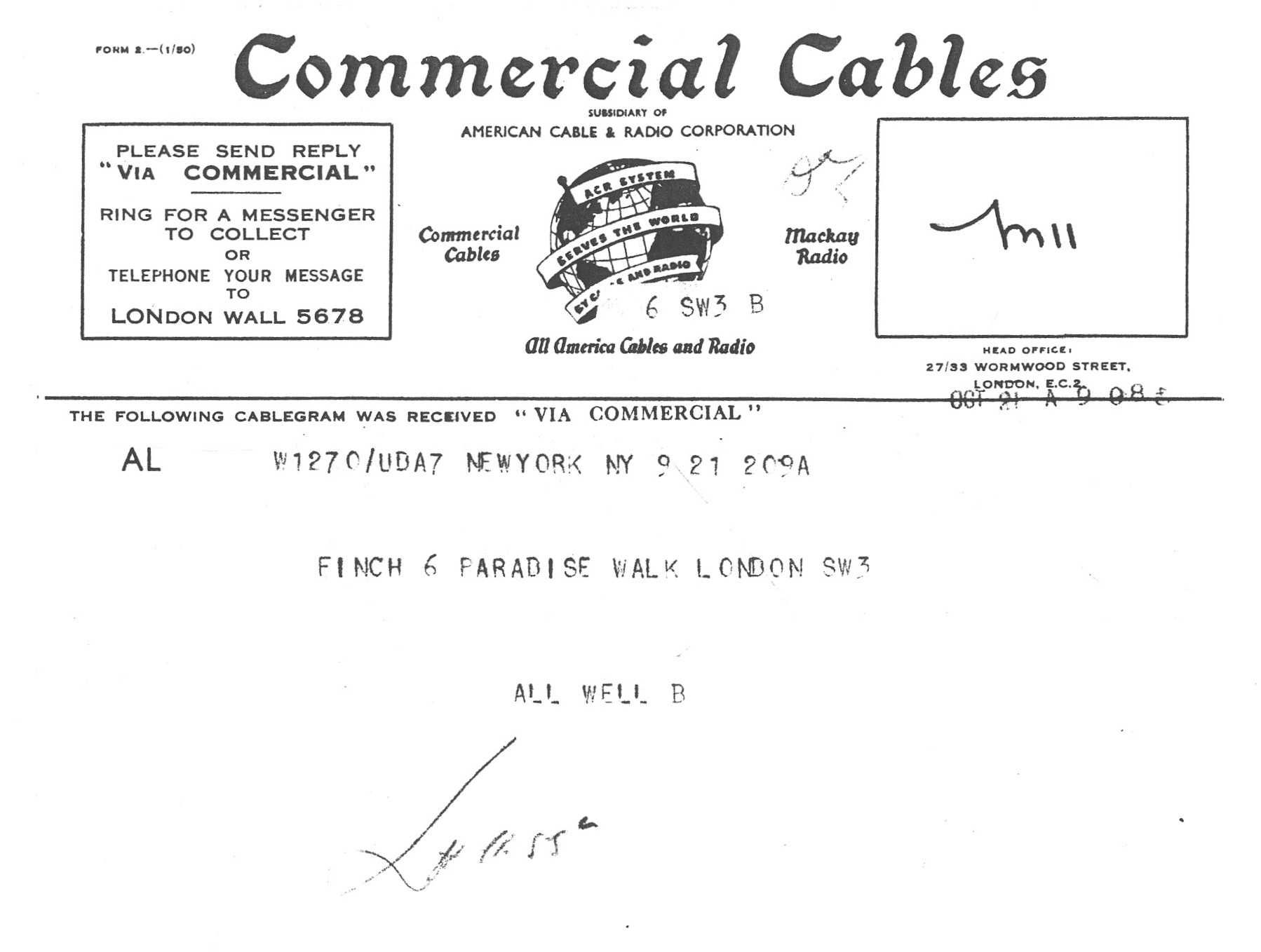 [document] The telegram was edited from a photocopy of the Commercial Cables telegram showing a date-received stamp made by a London office.