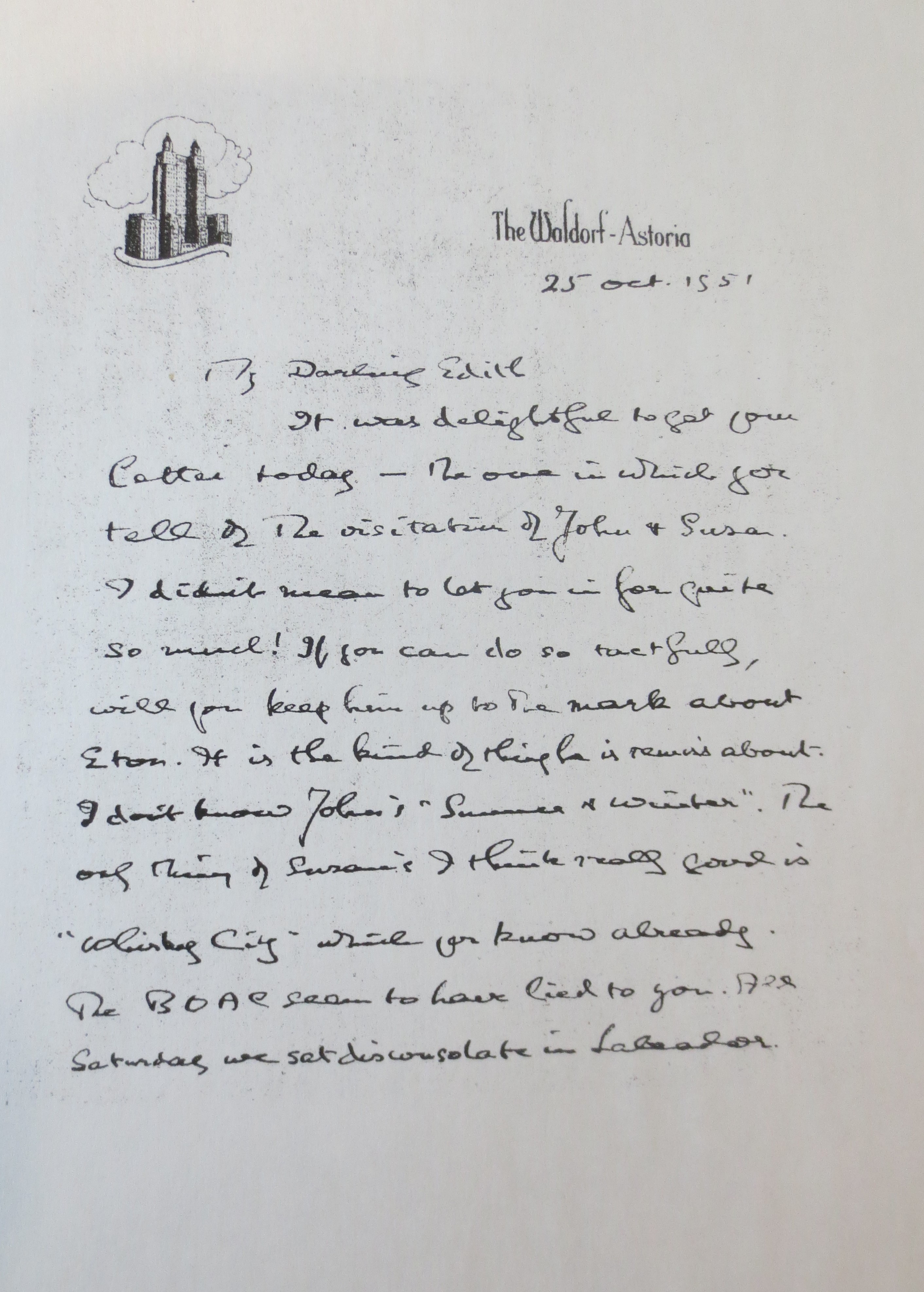 It was delightful to get your letter today3 — the one in which you tell of the visitation of John and Susan.4 I didn’t mean to let you in for quite so much! If you can do so tactfully, will you keep him up to the mark about Eton.5 It is the kind of thing he is remiss about. I don’t know John’s “Summer and Winter”. The only thing of Susan’s I think really good is “Whiskey City”6 which you know already. The BOAC seem to have lied to you. All Saturday we sat disconsolate in Labrador.
