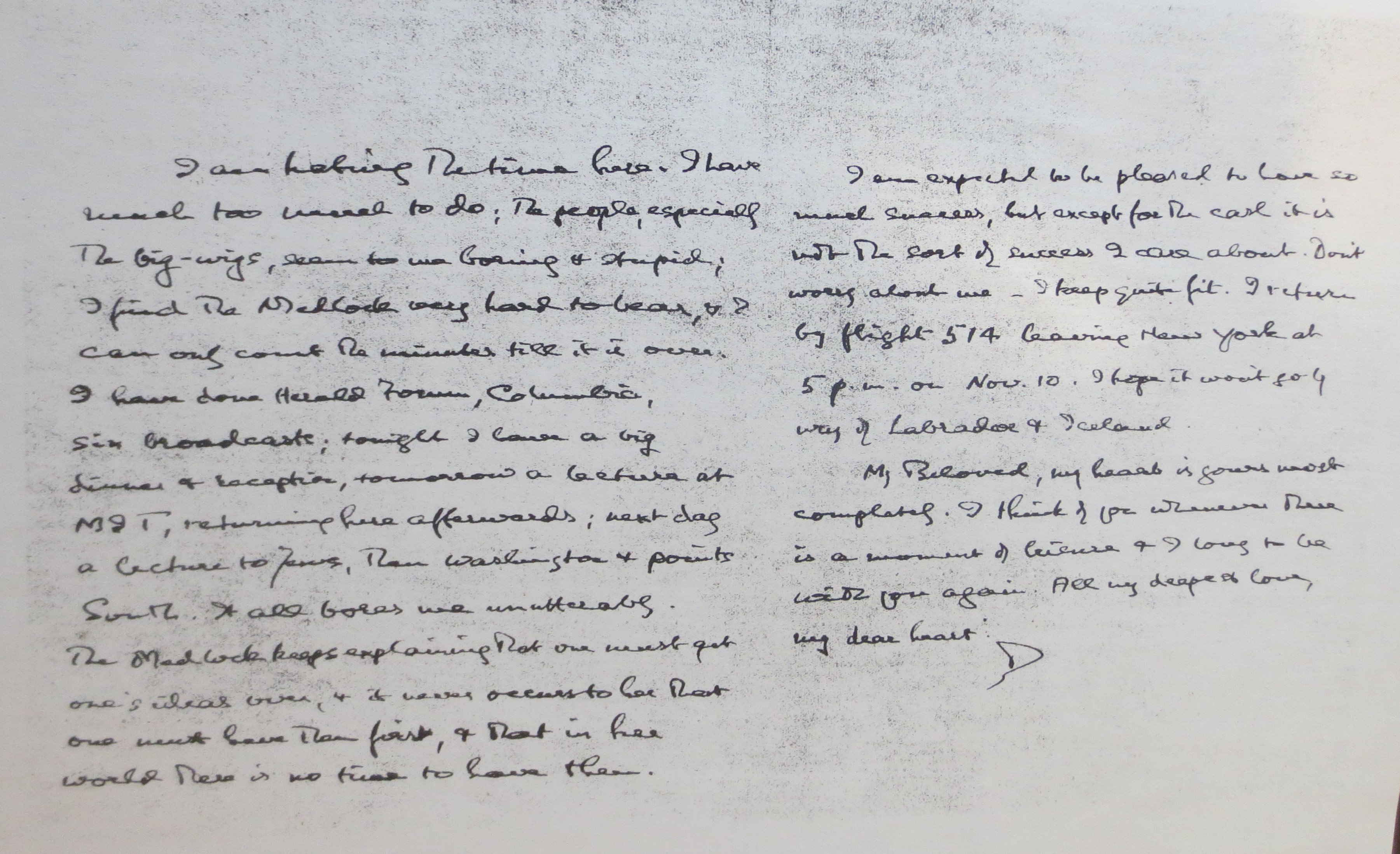I am expected to be pleased to have so much success, but except for the cash it is not the sort of success I care about. Don’t worry about me — I keep quite fit. I return by flight 514 leaving New York at 5 p.m. on Nov. 10. I hope it won’t go by way of Labrador and Iceland.