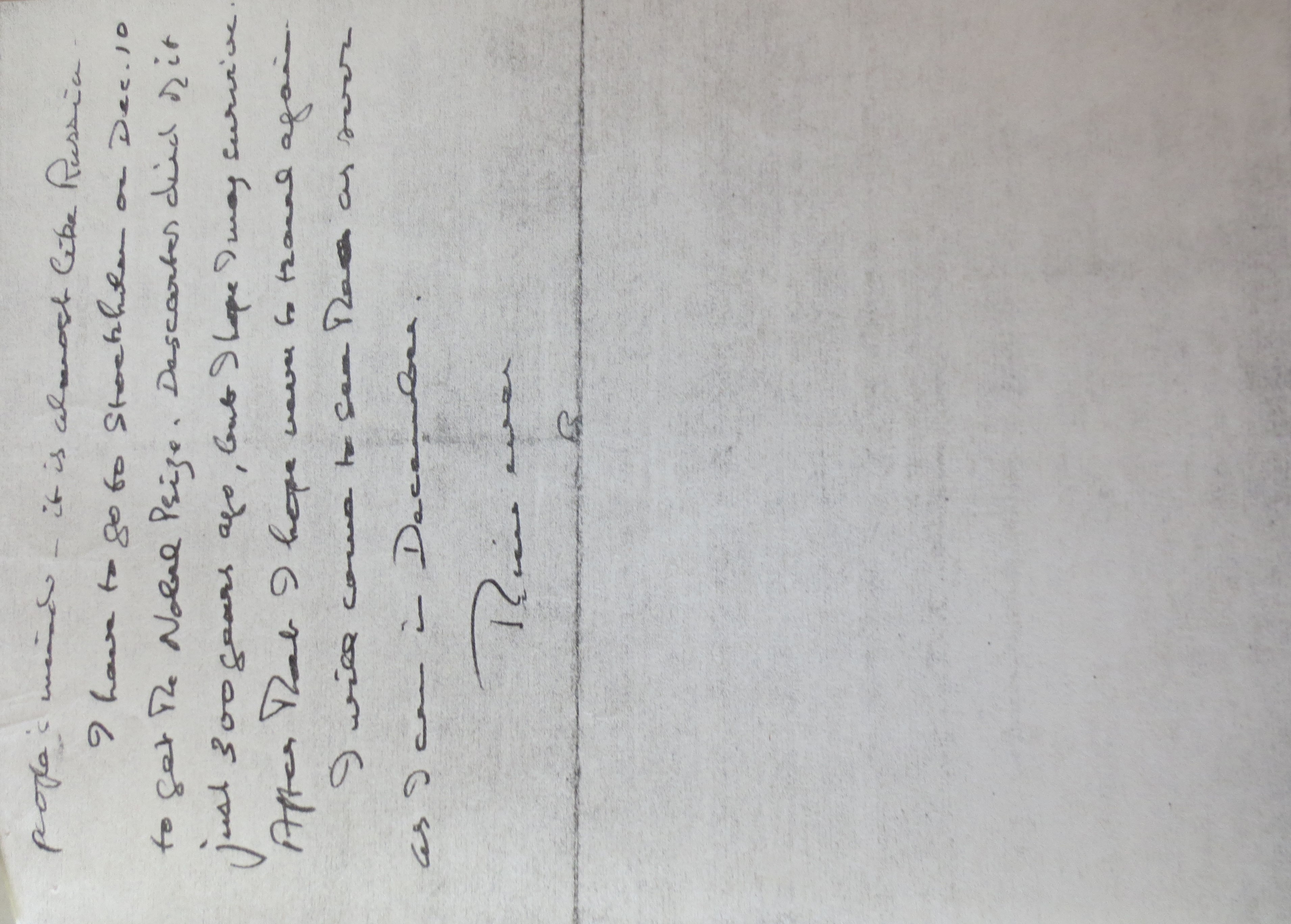 I have to go to Stockholm on Dec. 10 to get the Nobel Prize. Descartes died of it just 300 years ago,7 but I hope I may survive. After that I hope never to travel again.