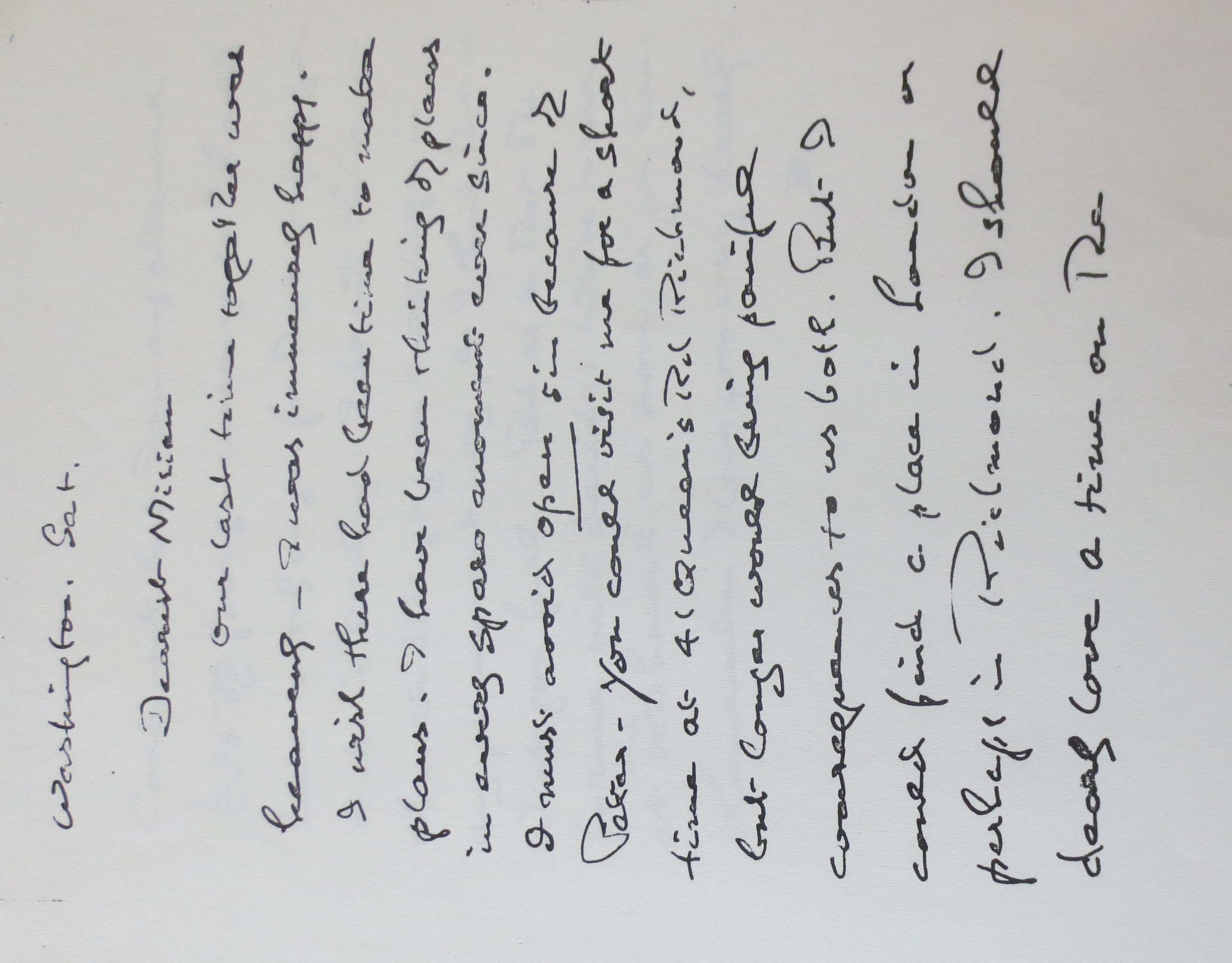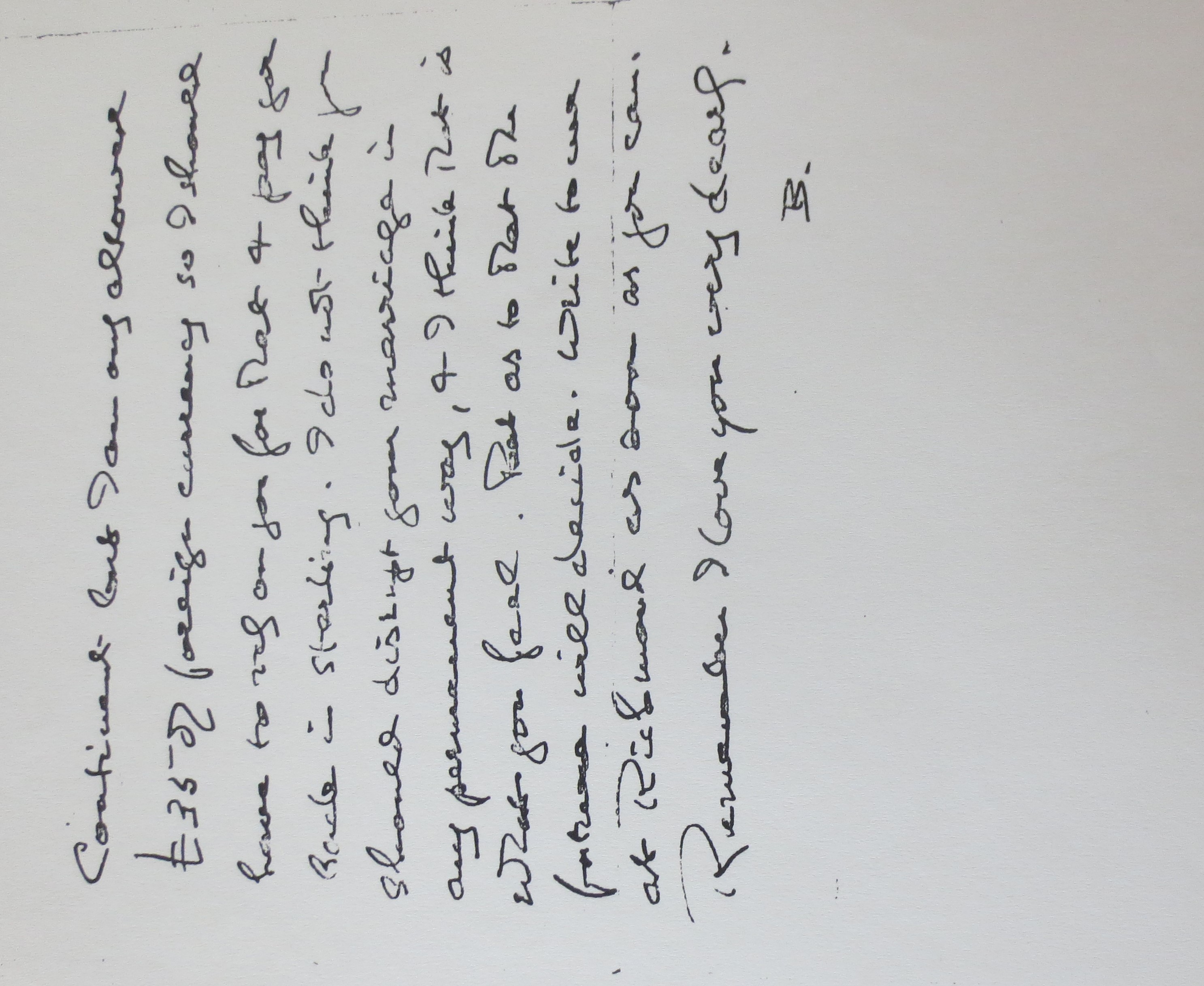 BR has been thinking of plans for them to be together. "I must avoid open sin because of Peter." BR would like a time on the continent with Miriam but is only allowed £35 of foreign currency. Dated 1950/11/18 because BR dated the letter simply "Washington. Sat." (See record 20239.)