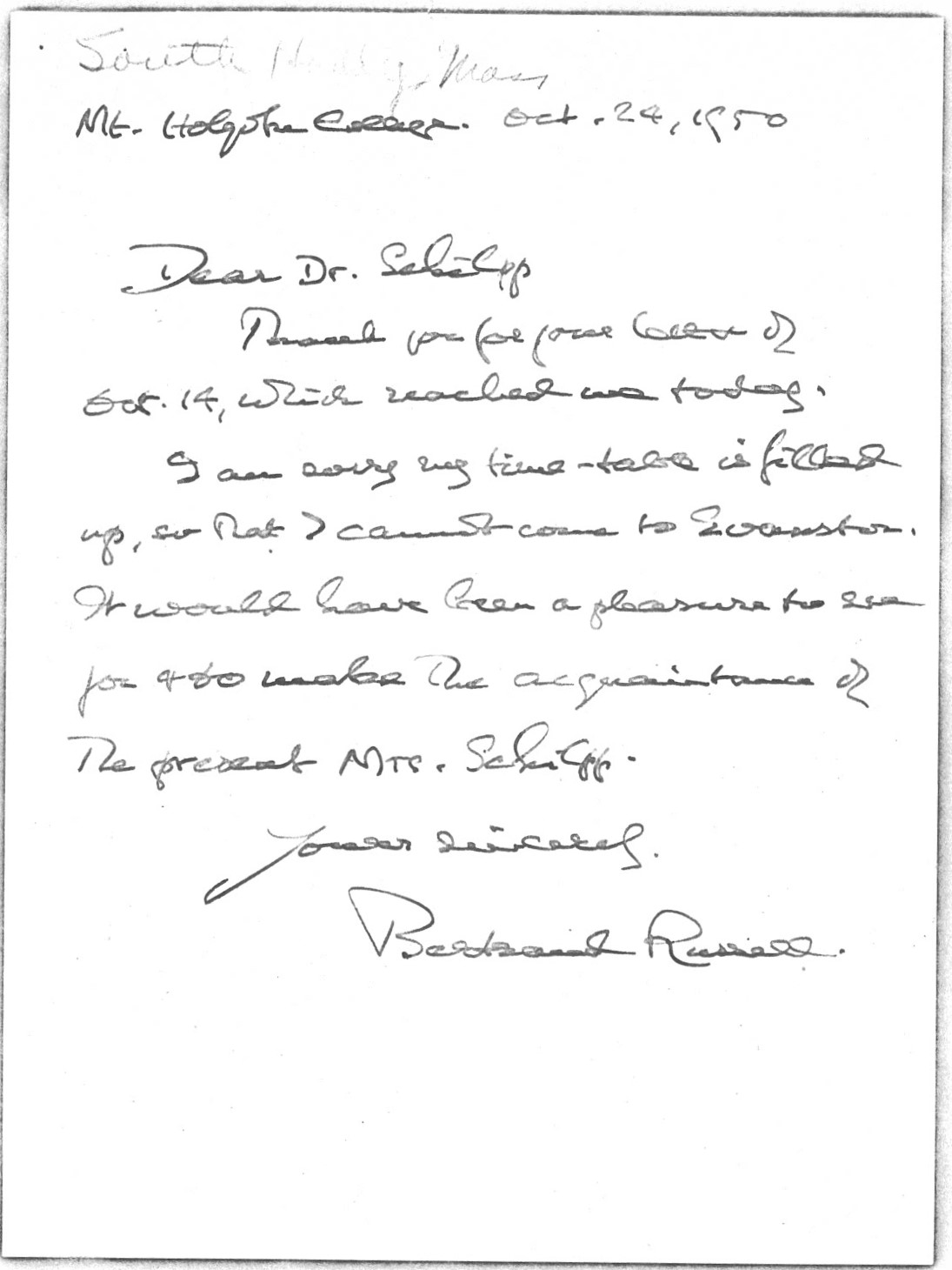 [document] The letter was edited from a photocopy (acquired by the Russell Archives from the recipient) of the signed original written in BR’s hand on a single leaf. "South Hadley, Mass." was written in the upper-centre of the single leaf document in another hand, presumably the recipient's.