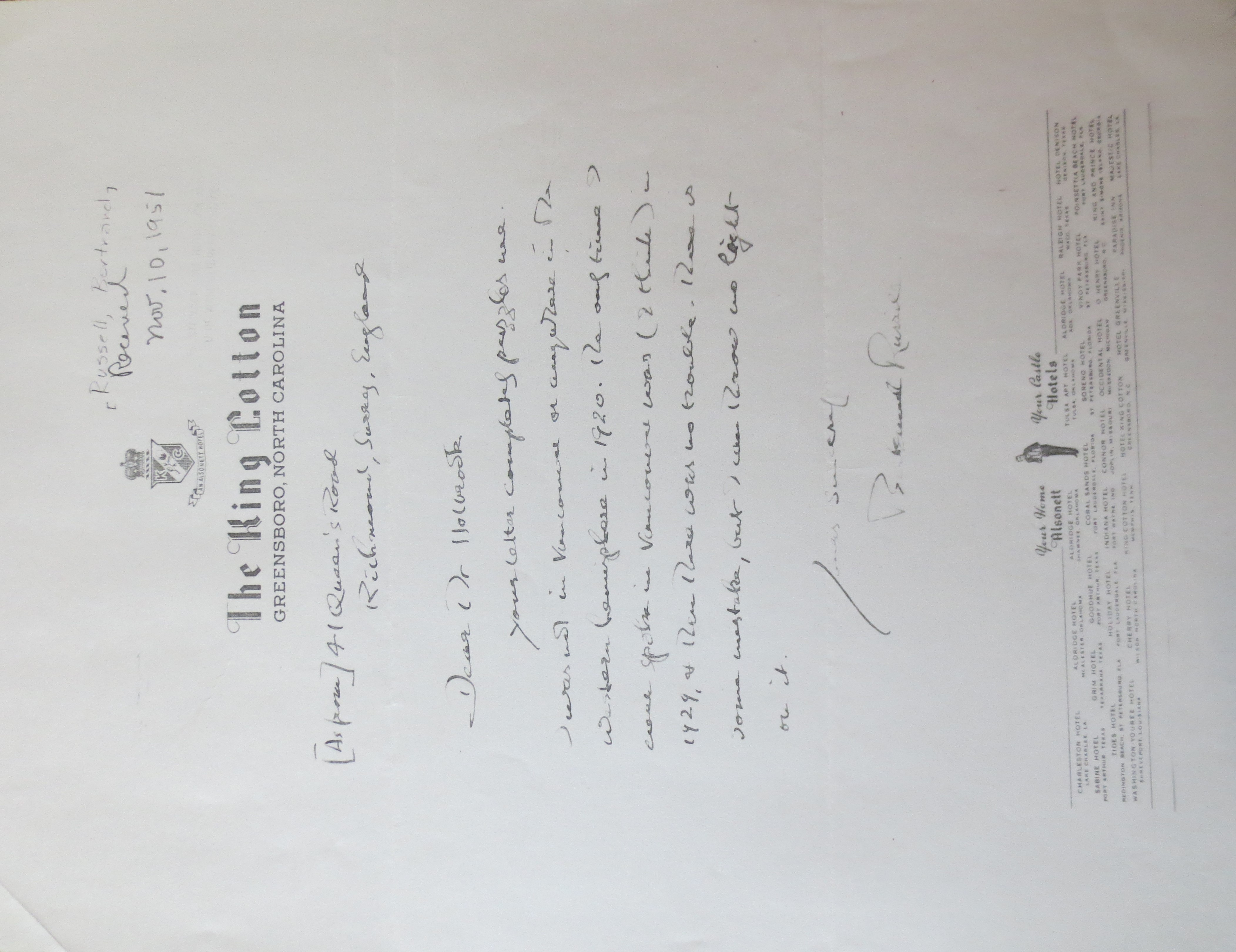 [document] The letter was edited from a photocopy of the signed original among the recipient’s papers in the University of Washington. It is written in BR’s hand on a single leaf of letterhead from the King Cotton Hotel, Greensboro, NC. The date has been inferred from the location of the hotel where BR stayed for one night only, on 5 November 1950. Immediately above the King Cotton’s letterhead an unidentified hand (presumably the recipient’s) noted that BR’s reply was “Received Nov. 10, 1951”.
