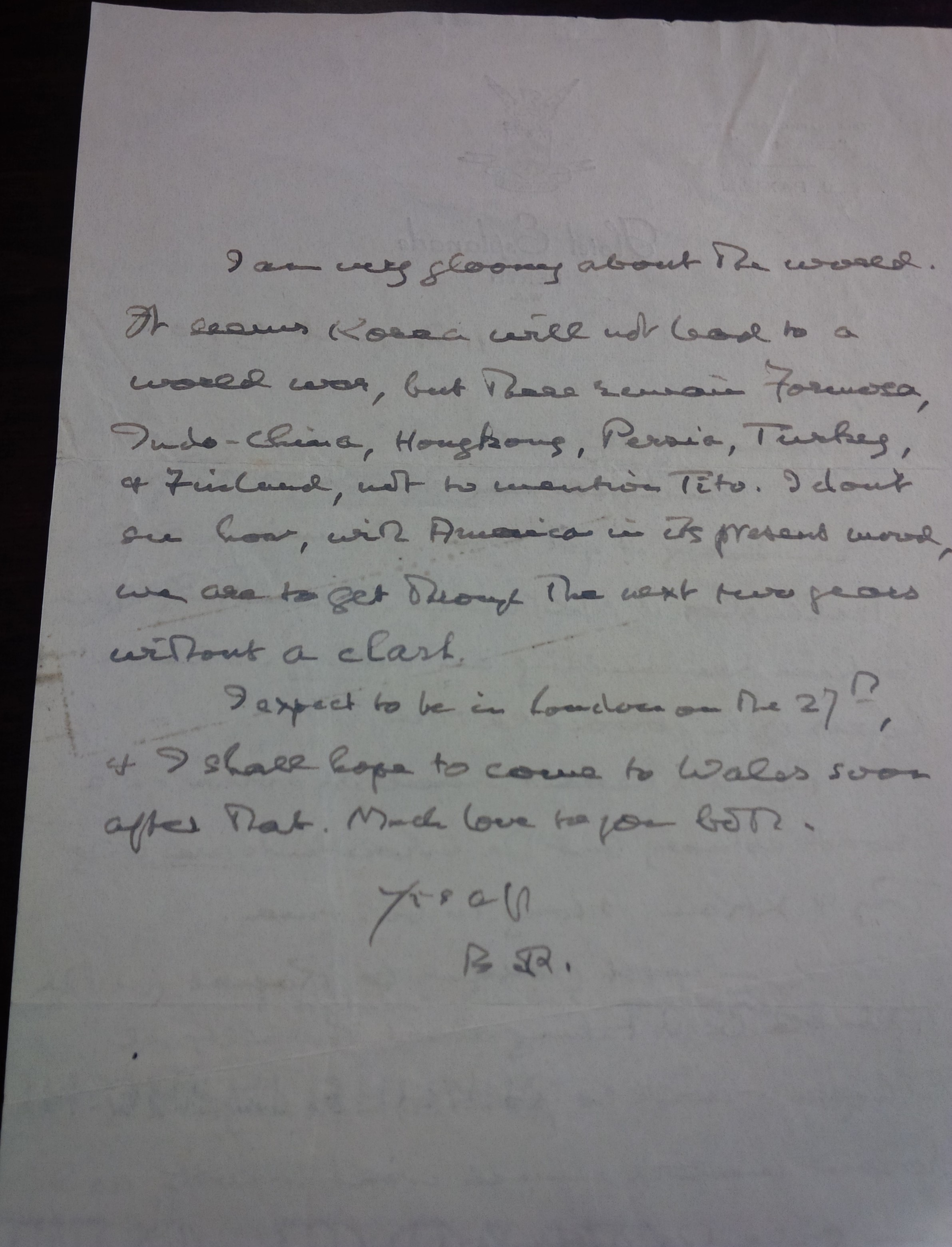 I am very gloomy about the world. It seems Korea will not lead to a world war, but there remain Formosa, Indo-China, Hongkong, Persia, Turkey, and Finland, not to mention Tito.5 I don’t see how, with America in its present mood, we are to get through the next two years without a clash.