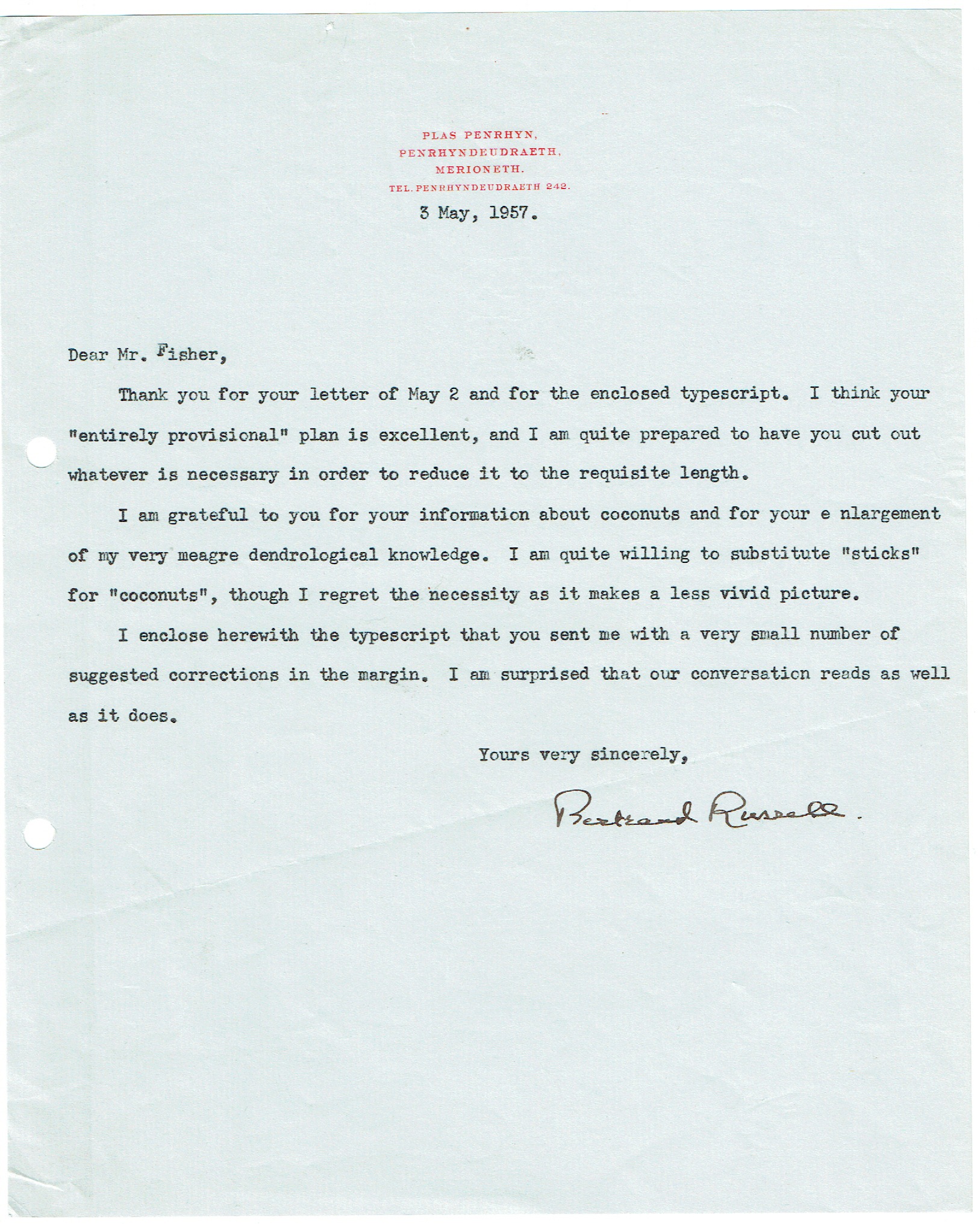 I enclose herewith the typescript that you sent me with a very small number of suggested corrections in the margin. I am surprised that our conversation reads as well as it does.